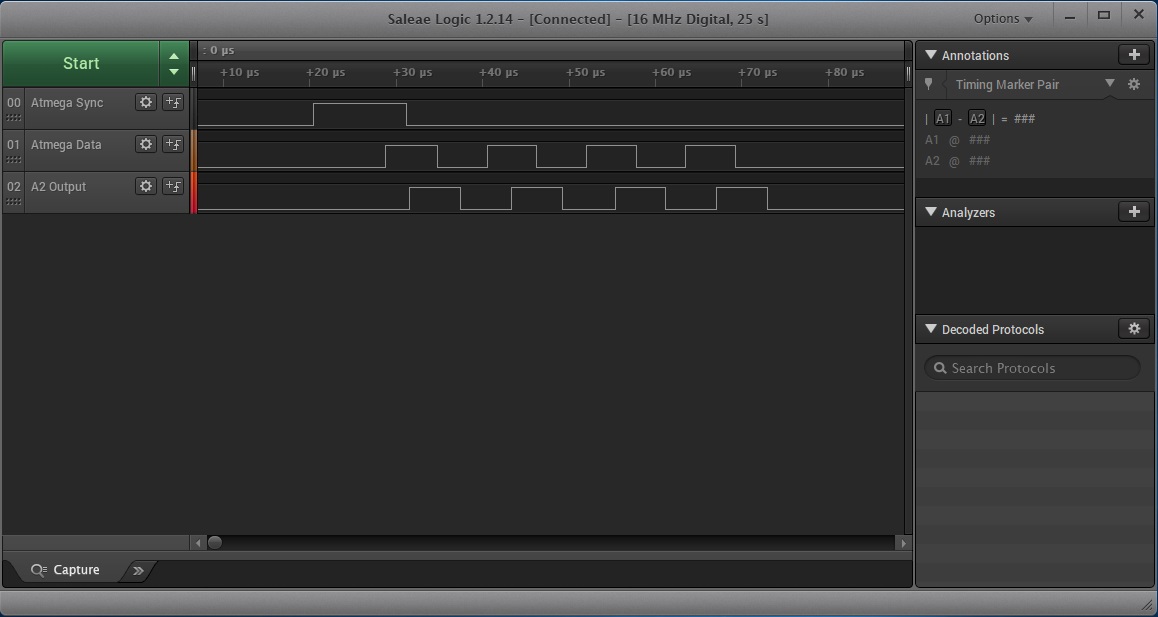 This design worked on my ROM1 IIGS and IIe machines but did not work on Ian's ROM3 IIGS. The wired SNES controllers would work but the wireless controllers would not. I tried to setup my IIGS as close as possible to Ian's and even tried his wireless controllers but I could not reproduce the problem. Luckily Ian had a logic analyser and hence was able to provide me with details as to what was going on. We tried a number of changes but to no avail. Having to do remote testing is never easy.
