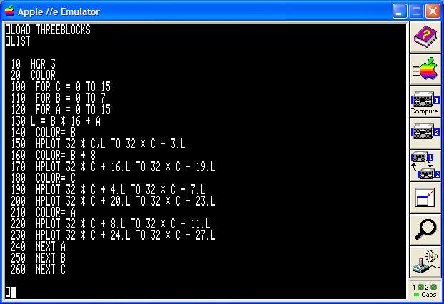 If we zoom into the bottom left corner of these screens. We can see how different they are. I have drawn circles showing how the AppleWin version is made up. In the middle circle we can see that the green and yellow colour is filled in as in screen shot B. The right circle shows how the blue is left thin like in screen shot C. The left circle shows how some colours can be transformed into other colours, which is unlike B or C. This evaluation does not show a clear relationship between the colours so more investigation was needed. Generation of these displays is a common problem among computer emulator developers so where better to start than the emulator developer forums. https://github.com/AppleWin/AppleWin/issues/254