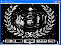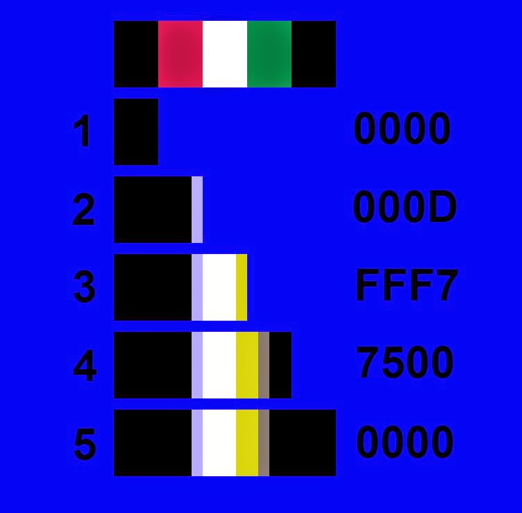 The above example is taken from screen shot B and how it is used to produce the colour as shown by the left most circle in screen shot D. In step 1 we lookup the colour blocks Black, Black and Magenta. This gives us 0000 (this is a hexadecimal number ranging from 0000 to FFFF. It represents the 16 Apple II colours for each of the four pixels) which we then colour in as Black, Black, Black and Black. In step two we lookup the value for Black, Magenta and White which returns 000D and we colour the next four pixels as Black, Black, Black and Light Blue. In step 3 we lookup Magenta, White and Dark Green which returns FFF7 and results in White, White, White and Yellow. The process goes on to complete the line and page. The result is a picture as follows.