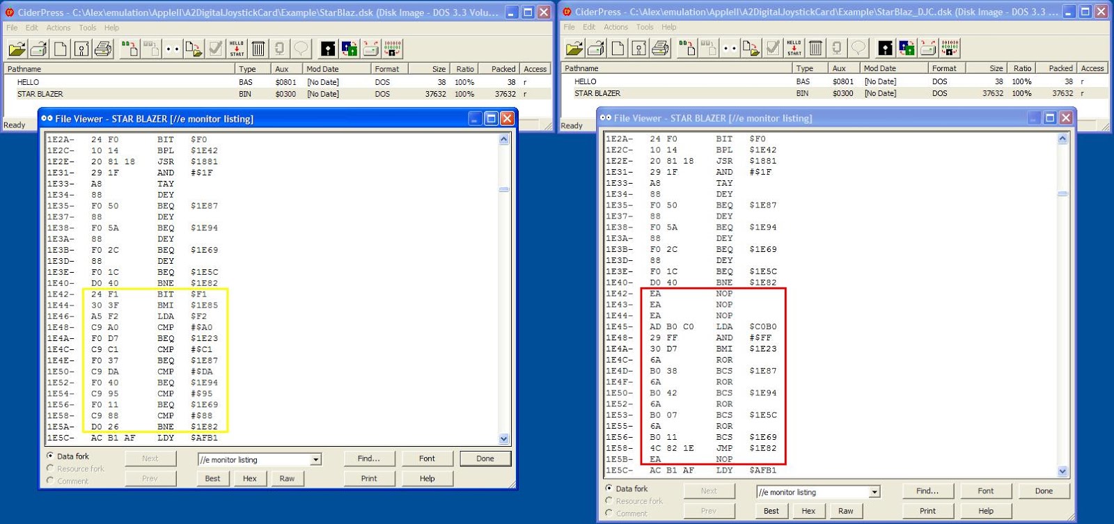 In looking at converting some old software I started with an old favourite of mine ie the game Star Blazer. It is easier to convert the keyboard handler of the game than it is to convert the joystick handler. All one needs to do is to find the keyboard entry point then just use a hex editor to convert the keyboard direction keys to the 4play direction positions. If you don't mind hard coding the 4play to a specific slot and selecting 4play operation by selecting the keyboard option within the game then this is an extremely effective hack. The resultant code is smaller than the original keyboard handler code so you can fit it all into the existing game memory. The picture above shows the original code in the yellow square and the converted code in the red square. Given a bit more time and a bit more memory a better conversion could be performed without too much more effort.